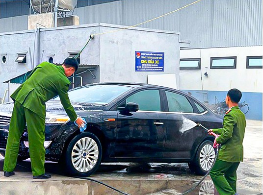 Đoàn viên thanh niên Phân trại Uông Bí tham gia rửa xe.