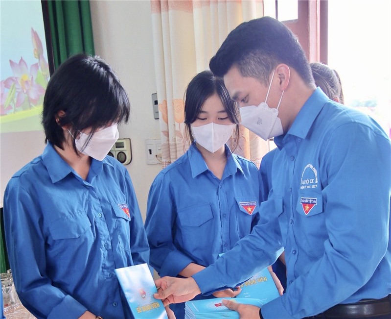 Bí thư Đoàn TNCS Hồ Chí Minh phường Phương Nam trao sổ đoàn cho đoàn viên mới.