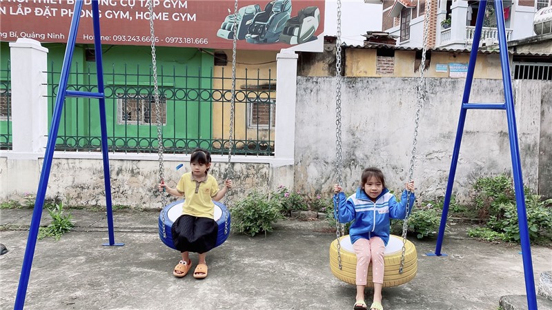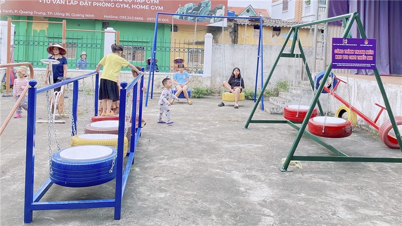 Sân chơi được Đoàn thanh niên phường triển khai xây dựng từ những vật liệu tái chế và vật liệu có sẵn. Từ những vỏ lốp xe ôtô cũ với bàn tay khéo léo, sự sáng tạo và tinh thần xung kích tình nguyện, các bạn đoàn viên, thanh niên đã tạo ra những đồ chơi vô cùng ngộ nghĩnh, đáng yêu, vừa an toàn, vừa gần gũi với thiên nhiên như xích đu, cầu trượt, bập bênh... với tổng kinh từ nguồn xã hội hóa là 20 triệu đồng.
