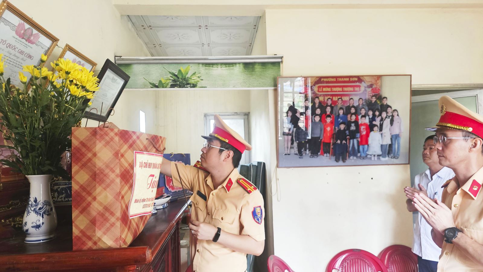 Cán bộ, chiến sĩ Đội Cảnh sát giao thông đường bộ số 1 thắp hương tưởng nhớ các liệt sĩ – người thân trong gia đình Mẹ Việt Nam Anh hùng Hoàng Thị Nghi để tri ân những hy sinh vì độc lập, tự do của Tổ quốc.