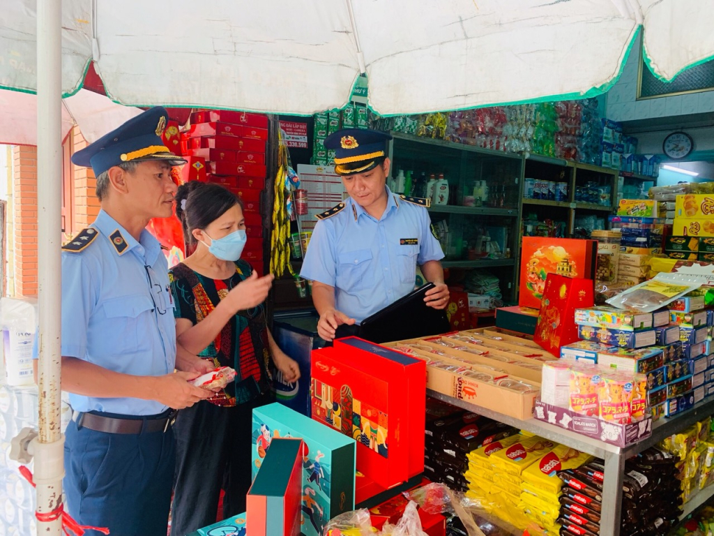 Đội QLTT số 6 kiểm tra việc niêm yết giá, nguồn gốc xuất xứ... sản phẩm bánh, kẹo trên địa bàn đơn vị quản lý.