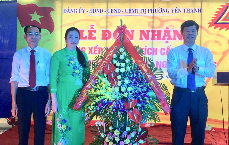 Đồng chí Phạm Tuấn Đạt, Phó Chủ tịch UBND thành phố Uông Bí tặng hoa chúc mừng cán bộ và nhân dân phường Yên Thanh.