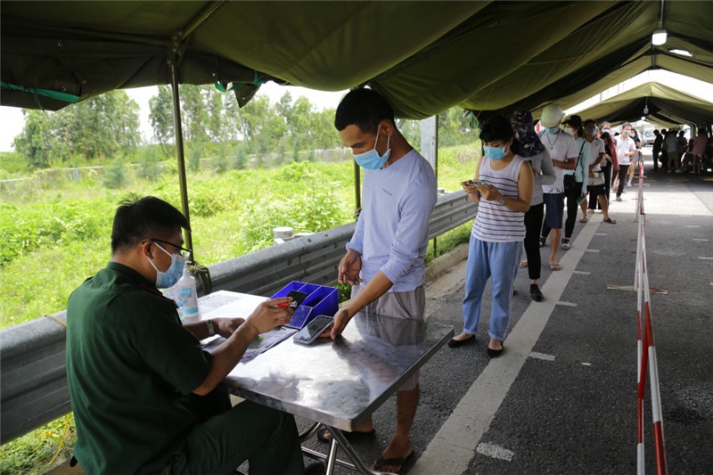 Người dân thực hiện khai báo y tế khi qua chốt kiểm soát phòng, chống dịch Covid-19 cầu Bạch Đằng (TX Quảng Yên).