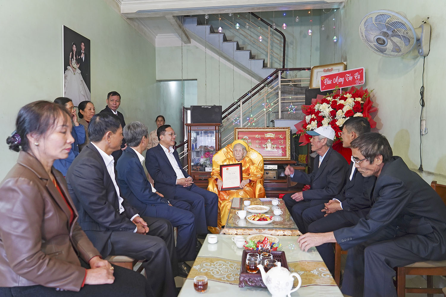 Đồng chí Bí thư Đảng ủy, Chủ tịch HĐND phường Thăm, tặng quà chúc thọ các cụ tròn 100 tuổi
