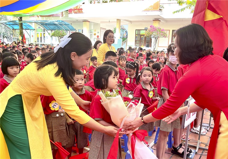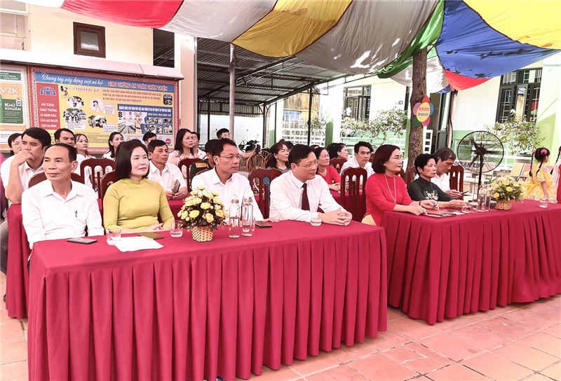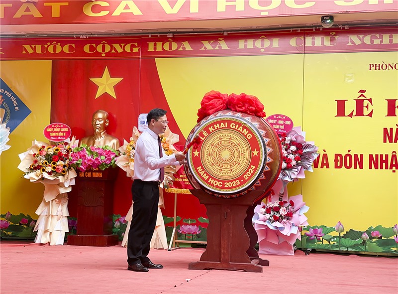 Thay mặt lãnh đạo thành phố, đồng chí Nghiêm Xuân Cường, Tỉnh ủy viên, Bí thư thành ủy, Chủ tịch HĐND thành phố đã trao tặng cô và trò nhà trường lẵng hoa tươi thắm cùng lời chúc mừng năm học mới với những kỳ vọng và thành tích mới.