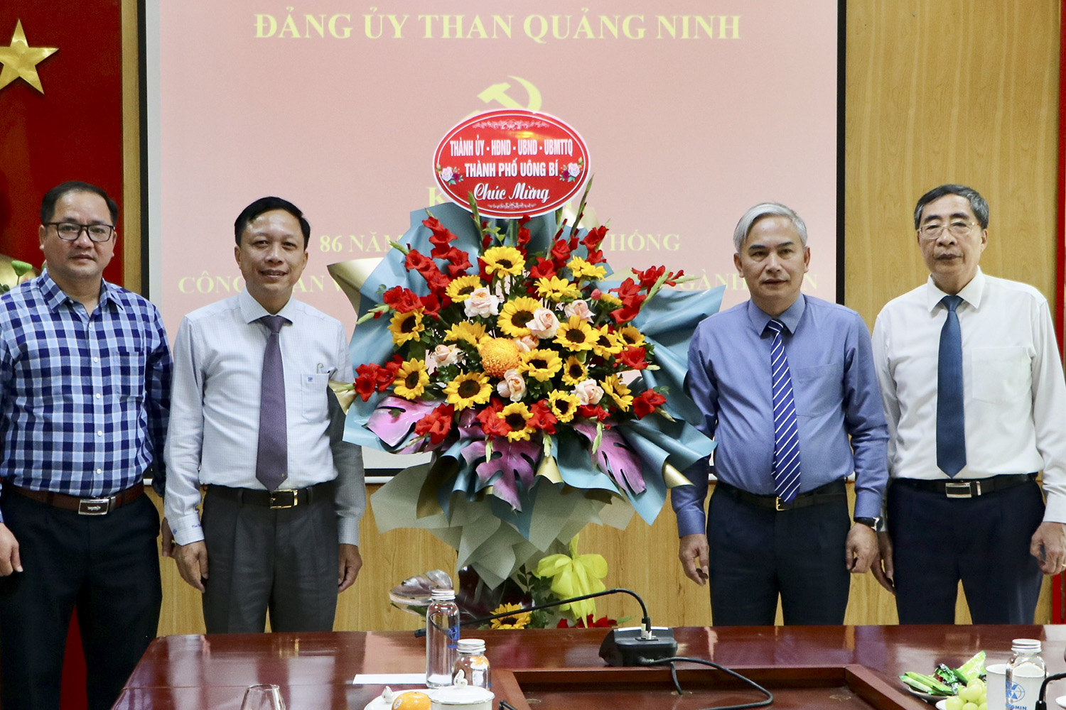 Đồng chí Nguyễn Chiến Thắng - Phó Bí thư Thường trực Thành uỷ Uông Bí tặng hoa chúc mừng lãnh đạo Tập đoàn Công nghiệp Than - Khoáng sản Việt Nam tại Trung tâm điều hành sản xuất Quảng Ninh.