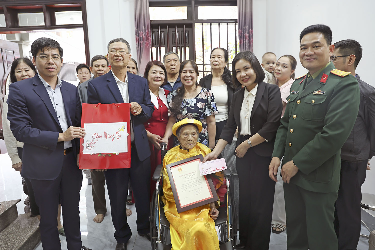 - Đồng chí Bí thư Đảng ủy, Chủ tịch HĐND phường Thăm, tặng quà chúc thọ các cụ tròn 100 tuổi