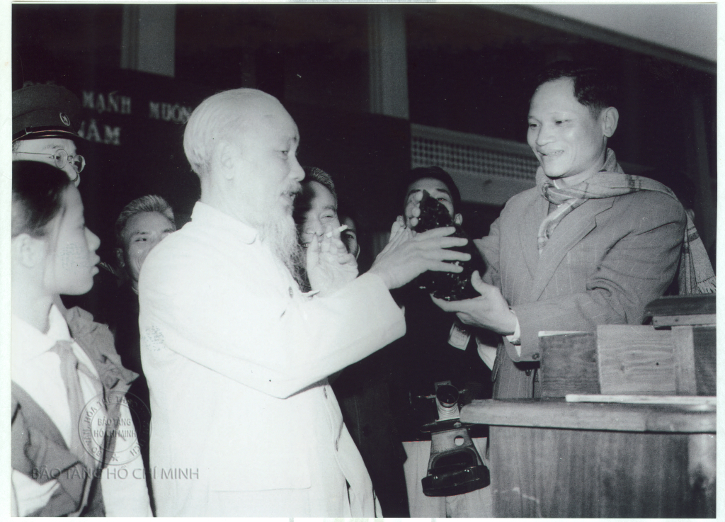 Đồng chí Nguyễn Thọ Chân, Bí thư Tỉnh uỷ Quảng Ninh tặng Bác Hồ "hòn than đầu tiên của kế hoạch khai thác năm 1965 vì miền Nam ruột thịt" tại lễ mít tinh đón Bác về ăn Tết với Quảng Ninh ngày mùng 1 Tết Ất Tỵ (1965). Ảnh: Bảo tàng Hồ Chí Minh