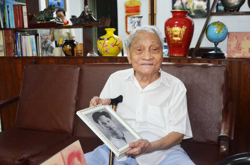 Đồng chí Nguyễn Thọ Chân và tấm ảnh thời trai trẻ. Ảnh chụp tại nhà riêng đồng chí Nguyễn Thọ Chân, tháng 5/2021. Ảnh: Phạm Học