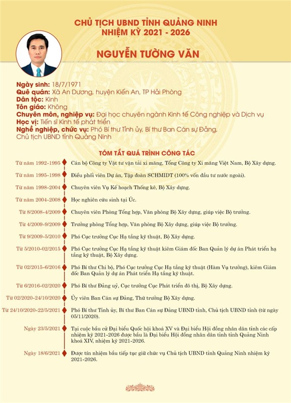 Tại Kỳ họp thứ nhất HĐND tỉnh Quảng Ninh khóa XIV, nhiệm kỳ 2021-2026, đồng chí Nguyễn Tường Văn, Phó Bí thư Tỉnh ủy, Chủ tịch UBND tỉnh nhiệm kỳ 2016-2021 đã được bầu tiếp tục giữ chức vụ Chủ tịch UBND tỉnh nhiệm kỳ 2021-2026 với số phiếu bầu tuyệt đối, 66/66 đại biểu tán thành, đạt 100%.