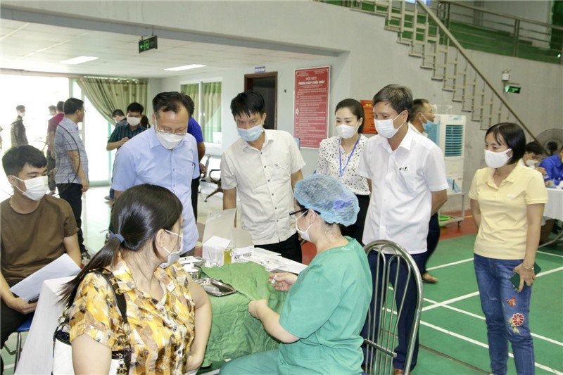 Đồng chí Nguyễn Văn Thành - Ủy viên BTV Thành ủy, PCT Thường trực UBND thành phố kiểm tra tại điểm tiêm Công ty Kho vận Đá Bạc - Vinacomin.
