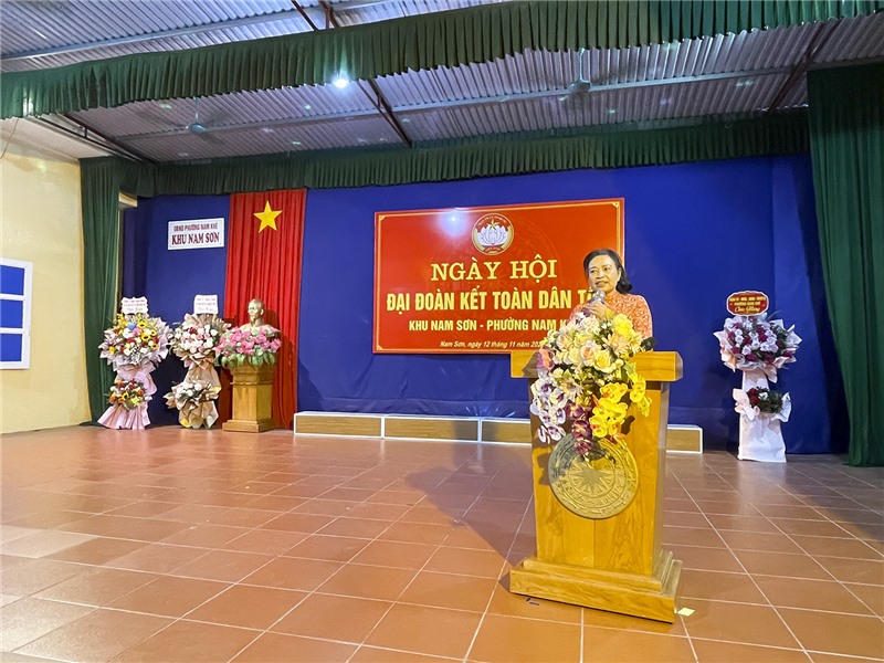 Trưởng ban công tác mặt trận khu Nam Sơn báo cáo tại Ngày hội.