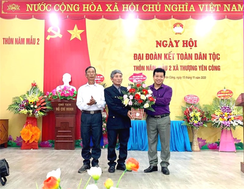 Lãnh đạo xã Thượng Yên Công tặng hoa chúc mừng cán bộ, nhân dân thôn Năm Mẫu 2.
