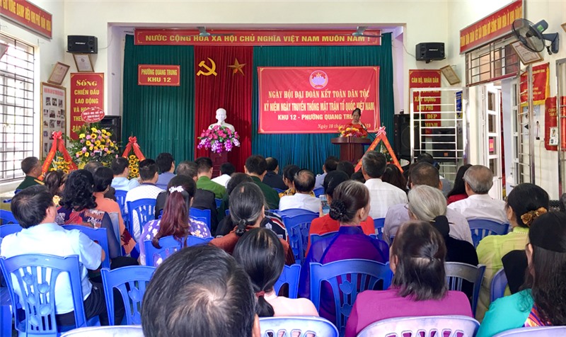 Cũng trong ngày hội đại đoàn kết toàn dân, khu 12 sôi nổi tham gia giao lưu bóng chuyền hơi với các khu dân cư trên địa bàn phường Quang Trung; tổ chức thi mâm cơm đại đoàn kết giữa các tổ dân trong khu phố.