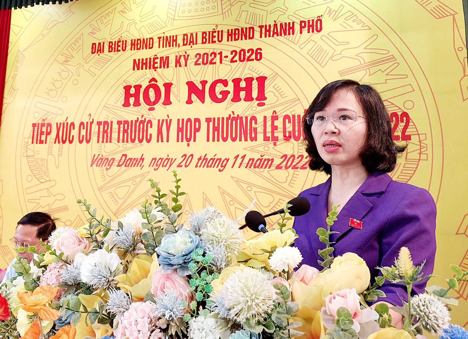 Tại buổi tiếp xúc, đồng chí Trịnh Thị Minh Thanh, Phó Bí thư Tỉnh uỷ, đại diện tổ đại biểu HĐND tỉnh đã thông báo tới cử tri phường Vàng Danh về tình hình phát triển kinh tế-xã hội, hoạt động của HĐND tỉnh từ đầu năm 2022 đến thời điểm tiếp xúc, dự kiến nội dung chương trình kỳ họp thường lệ cuối năm 2022, HĐND tỉnh khóa XIV, nhiệm kỳ 2021-2026; thông báo kết quả giải quyết kiến nghị của cử tri TP Uông Bí gửi đến HĐND tỉnh trong kỳ họp trước.