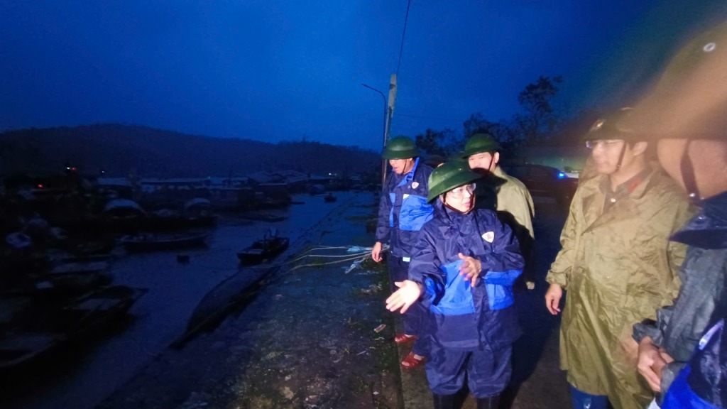 Tối 7/9, ngay sau khi bão Yagi quét qua Quảng Ninh, đồng chí Trịnh Thị Minh Thanh, Phó Bí thư Thường trực Tỉnh ủy, đã đến kiểm tra tình hình đảm bảo an toàn cho tàu thuyền neo đậu tránh trú bão tại Cảng cá Cái Xà Cong, phường Hà Phong, TP Hạ Long.
