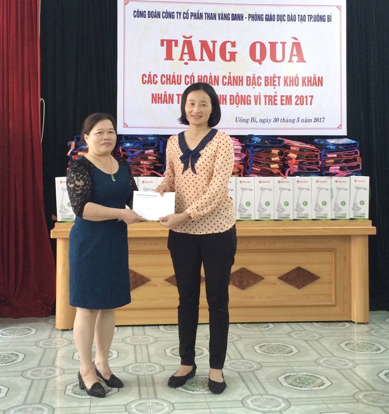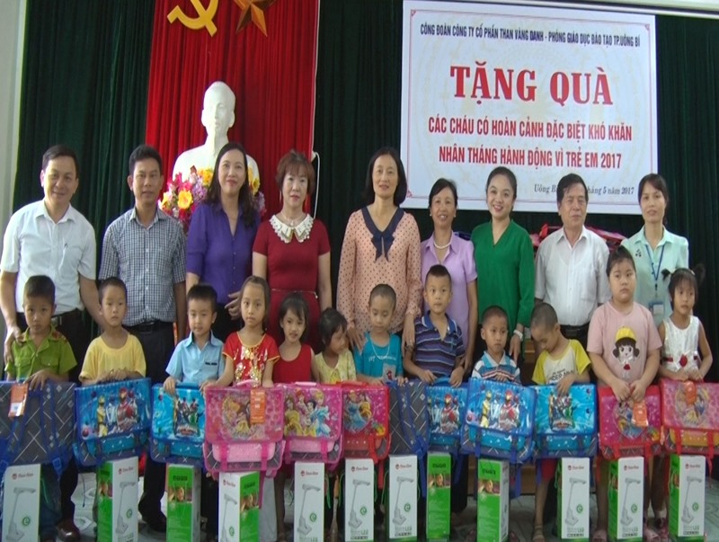 100 em học sinh chuẩn bị vào lớp 1 có hoàn cảnh đặc biệt khó khăn thuộc 13 Trường Mầm non đã được các bác, các cô đại diện Công đoàn Công ty Than Vàng Danh trao những phần quà có ý nghĩa gồm cặp sách, đèn bàn. Trị giá mỗi phần quà 500 ngàn đồng.
