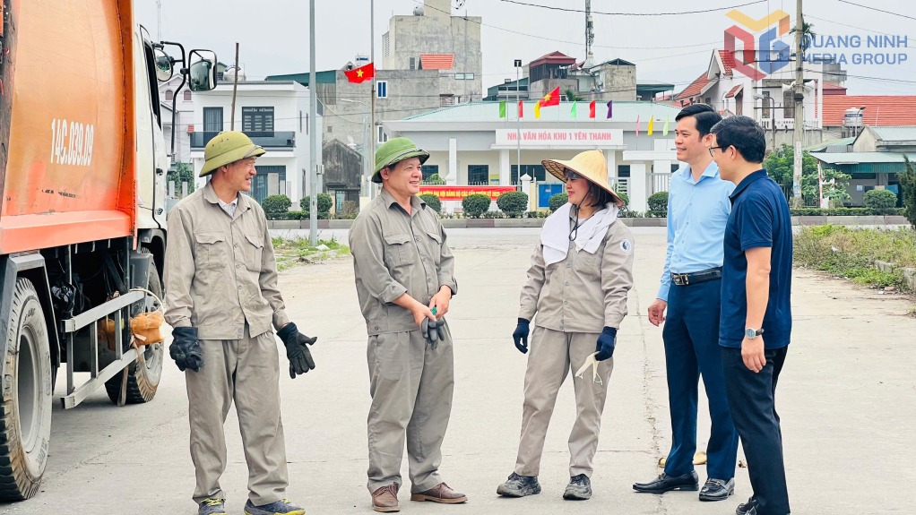 Cán bộ LĐLĐ thành phố Uông Bí và Công đoàn Công ty CP Môi trường và Công trình đô thị Uông Bí động viên công nhân tại vị trí làm việc.