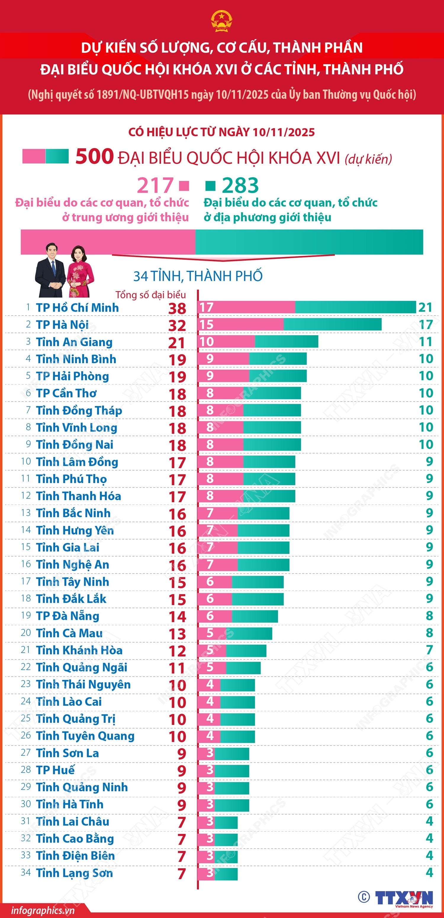 Theo đó, Ủy ban Thường vụ Quốc hội quyết nghị tổng số đại biểu Quốc hội khóa XVI là 500 người. Dự kiến số lượng, cơ cấu, thành phần đại biểu Quốc hội ở trung ương và địa phương như sau: Số lượng đại biểu ở các cơ quan trung ương là 217 đại biểu (43,4%) và số lượng đại biểu Quốc hội ở địa phương là 283 đại biểu (56,6%).