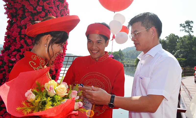 Ông Nguyễn Mạnh Hà, Chủ tịch UBND TP Uông Bí, trao khóa tình yêu cho đôi uyên ương chọn điểm du lịch hồ Yên Trung chụp ảnh cưới.