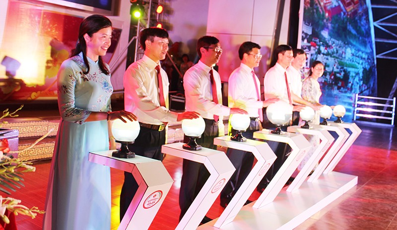Các đại biểu ấn nút khai trương ứng dụng du lịch thông minh Uông Bí trên điện thoại di động (APP du lịch Uông Bí).
