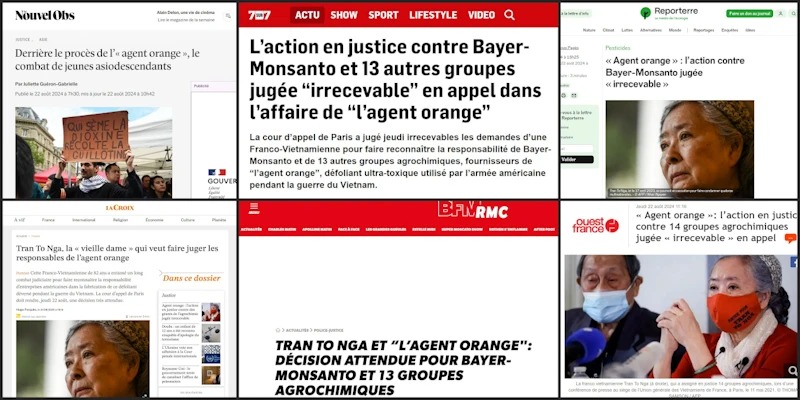 Ngoài ra, phán quyết của Tòa Phúc thẩm Paris bác bỏ kháng cáo của bà Trần Tố Nga cũng là chủ đề quan tâm của nhiều báo lớn nhỏ và các trang thông tin điện tử tại Pháp. Hàng loạt những bài báo được xuất bản trên các trang tin điện tử của Đài truyền hình BFM, TV5 Monde, La Croix, Le Nouvel Obs, Reporterre, Nouvelles Du Jour, Ouest France, 7 sur 7… đều có chia sẻ chung những quan điểm ủng hộ một cuộc đấu tranh pháp lý đầy thử thách vì công lý và quyền lợi của những nạn nhân chất độc da cam Việt Nam.