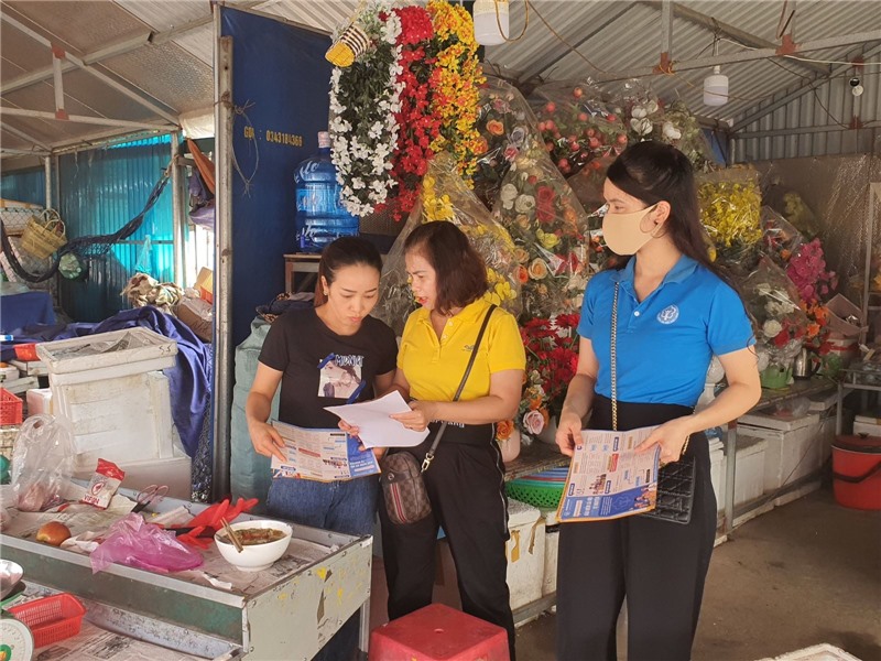 Nhân viên BHXH huyện Hải Hà tuyên truyền, hướng dẫn các tiểu thương chợ trung tâm Hải Hà 2 (huyện Hải Hà) tham gia BHXH tự nguyện.