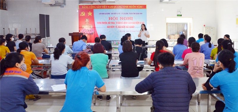 BHXH tỉnh phối hợp tổ chức hội nghị tuyên truyền, đối thoại, tư vấn về chính sách BHXH, BHYT, BHTN cho người sử dụng lao động, cán bộ làm công tác lao động, tiền lương, BHXH... ở các doanh nghiệp trong KCN Cái Lân (TP Hạ Long), tháng 4/2023. Ảnh: Dương Trường