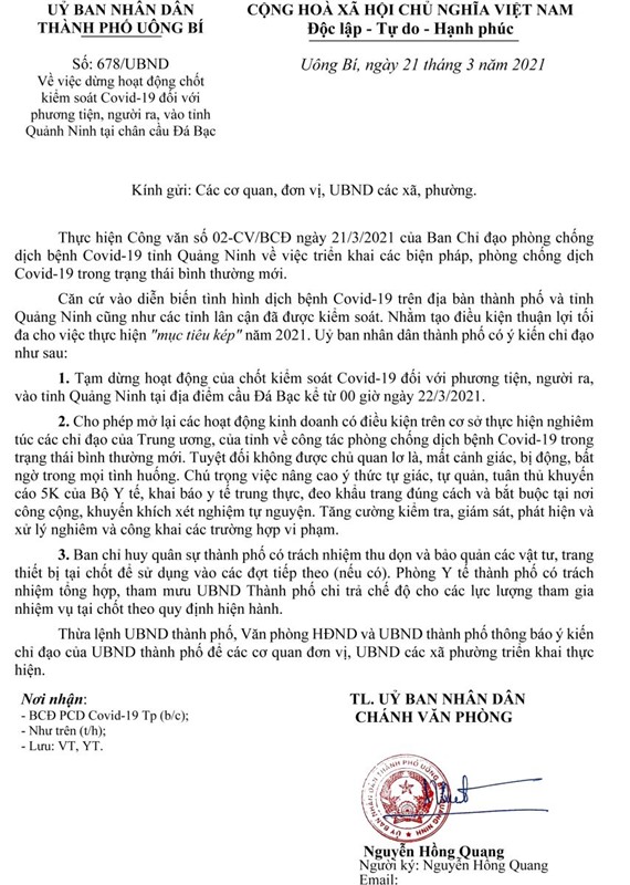 Ngày 21-3, Ủy ban nhân dân thành phố Uông Bí ban hành văn bản số 678/UBND về việc dừng hoạt động chốt kiểm soát Covid-19 đối với phương tiện, người ra, vào tỉnh Quảng Ninh tại chân cầu Đá Bạc.