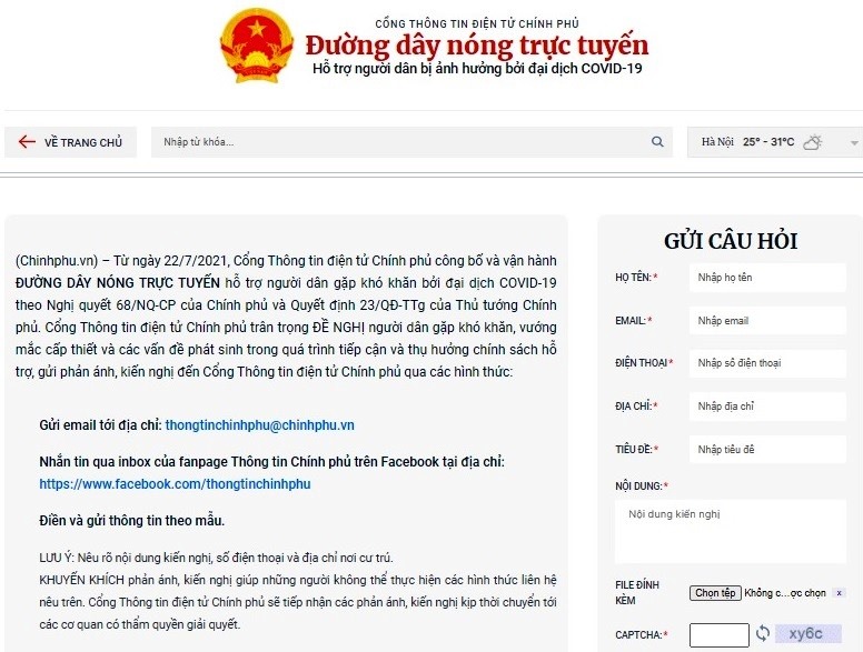 Từ ngày 22/7/2021, Cổng Thông tin điện tử Chính phủ công bố và vận hành ĐƯỜNG DÂY NÓNG TRỰC TUYẾN hỗ trợ người dân gặp khó khăn bởi đại dịch COVID-19 theo Nghị quyết 68/NQ-CP của Chính phủ và Quyết định 23/2021/QĐ-TTg của Thủ tướng Chính phủ.