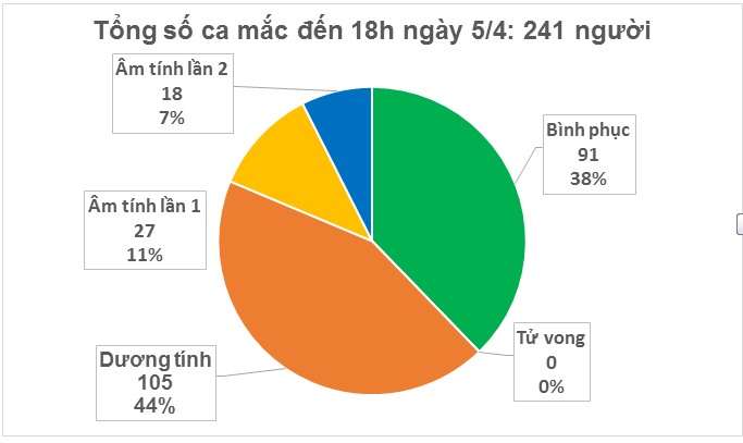 18h00, Bộ Y tế chính thức công bố ca mắc COVID-19 thứ 241 tại Việt Nam. Như vậy trong cả ngày hôm nay 5/4, nước ta chỉ ghi nhận 01 ca mắc mới. Cũng trong ngày hôm nay, BN57 đã được công bố khỏi bệnh nâng tổng số ca khỏi bệnh ở nước ta lên 91 trường hợp.
