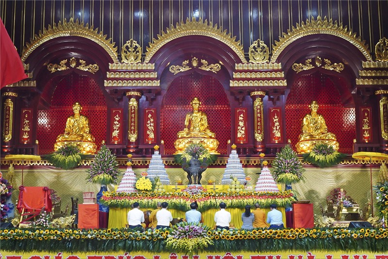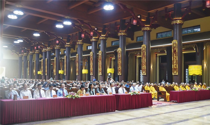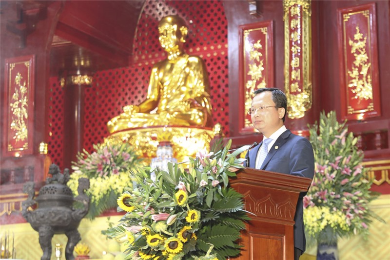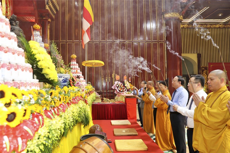 Các đồng chí lãnh đạo tỉnh, thành phố, Ban Trị sự Giáo hội phật giáo Việt Nam tỉnh Quảng Ninh thực hiện nghi thức hô thần nhập tượng Trúc Lâm tam tổ trong cung Trúc Lâm. Ảnh: Đỗ Phương