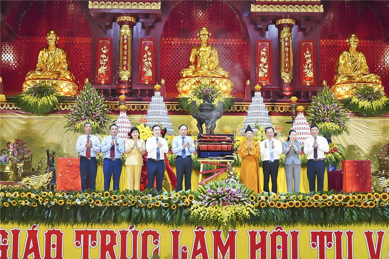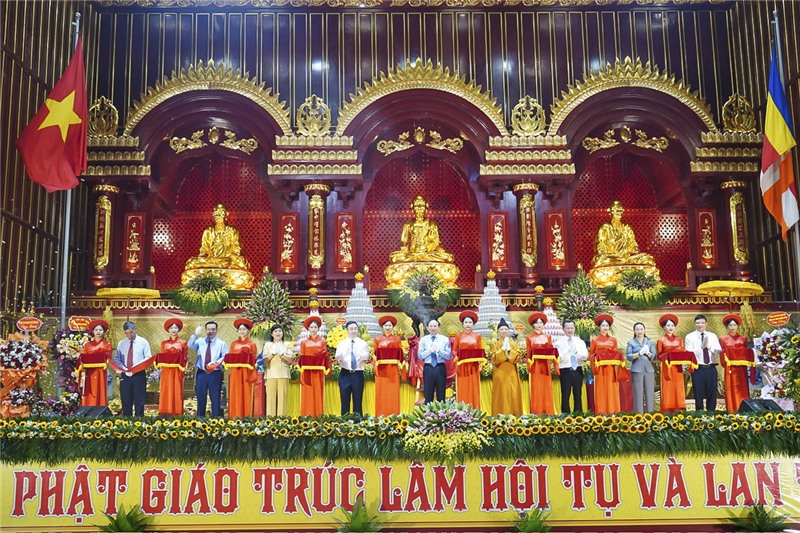 Các đồng chí lãnh đạo tỉnh, thành phố, lãnh đạo Ban Trị sự GHPG Việt Nam tỉnh Quảng Ninh cắt băng khánh thành cung Trúc Lâm Yên Tử.