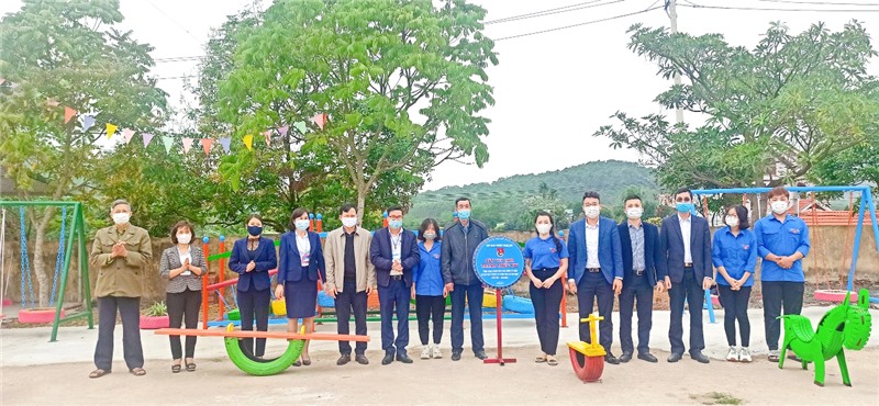 Các đại biểu làm lễ gắn biển công trình thanh niên sân chơi thiếu nhi tại khu 10, phường Thanh Sơn.