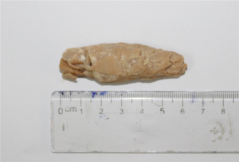Khối thức ăn kích thước 6x2 cm được gắp bỏ khỏi thực quản của người bệnh.