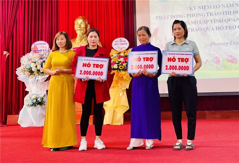 Hưởng ứng phát động của Hội LHPN phường Phương Đông, 12 chi hội phụ nữ khu dân cư trên địa bàn đã đăng ký những phần việc, công trình cụ thể, thiết thực để giúp hội viên phụ nữ hộ nghèo, cận nghèo và trẻ em mồ côi. Nhân dịp này, Hội LHPN phường Phương Đông đã trao quà hỗ trợ cho 3 hội viên phụ nữ có hoàn cảnh khó khăn trên địa bàn, động viên các gia đình cố gắng vươn lên ổn định cuộc sống.