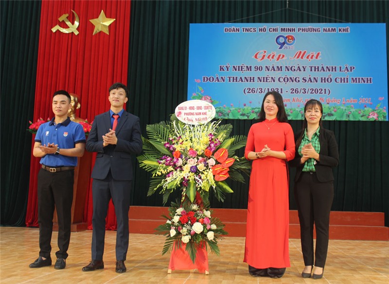Lãnh đạo Thành đoàn, phường Nam Khê tặng hoa chúc mừng tại buổi gặp mặt.