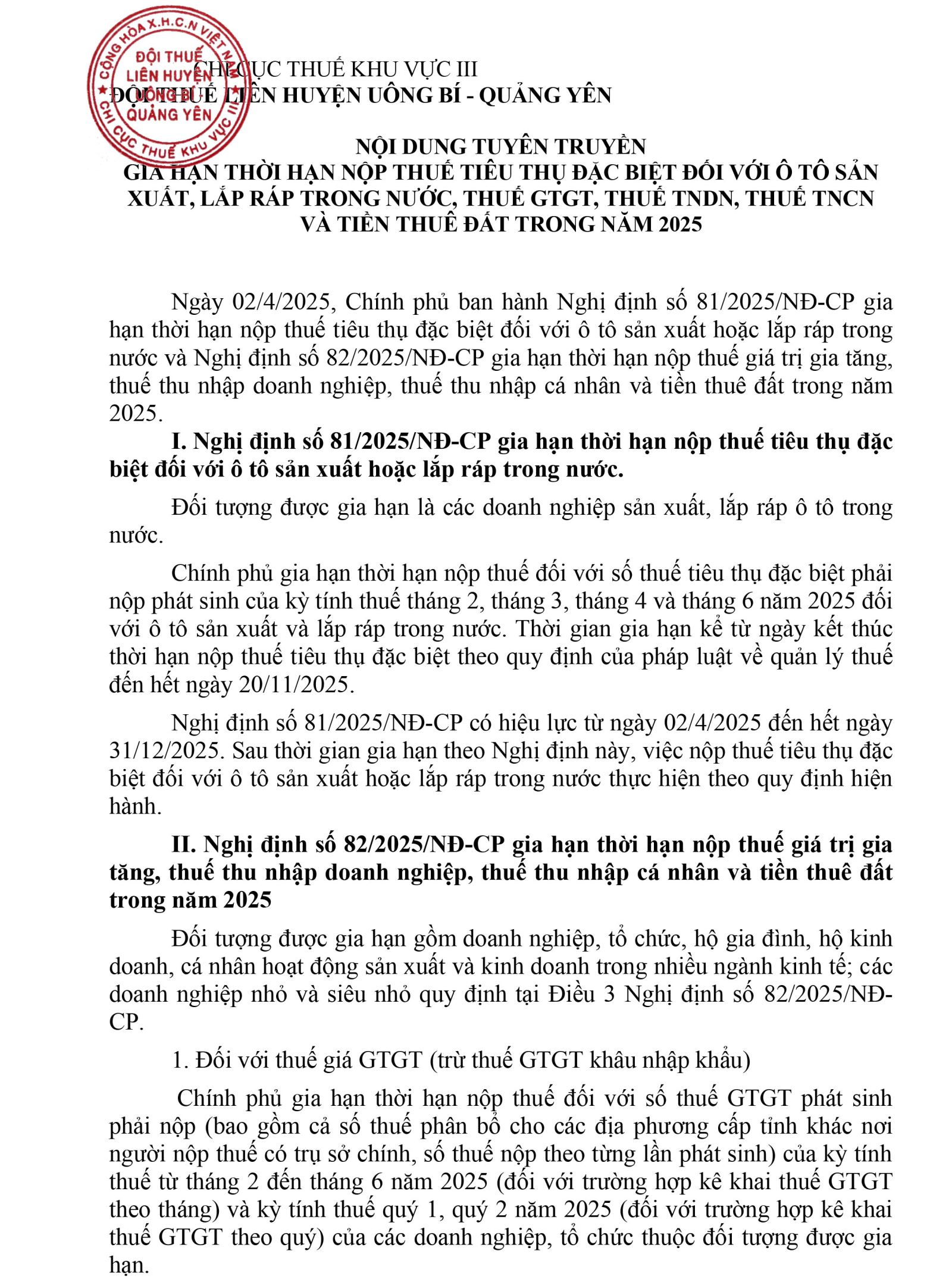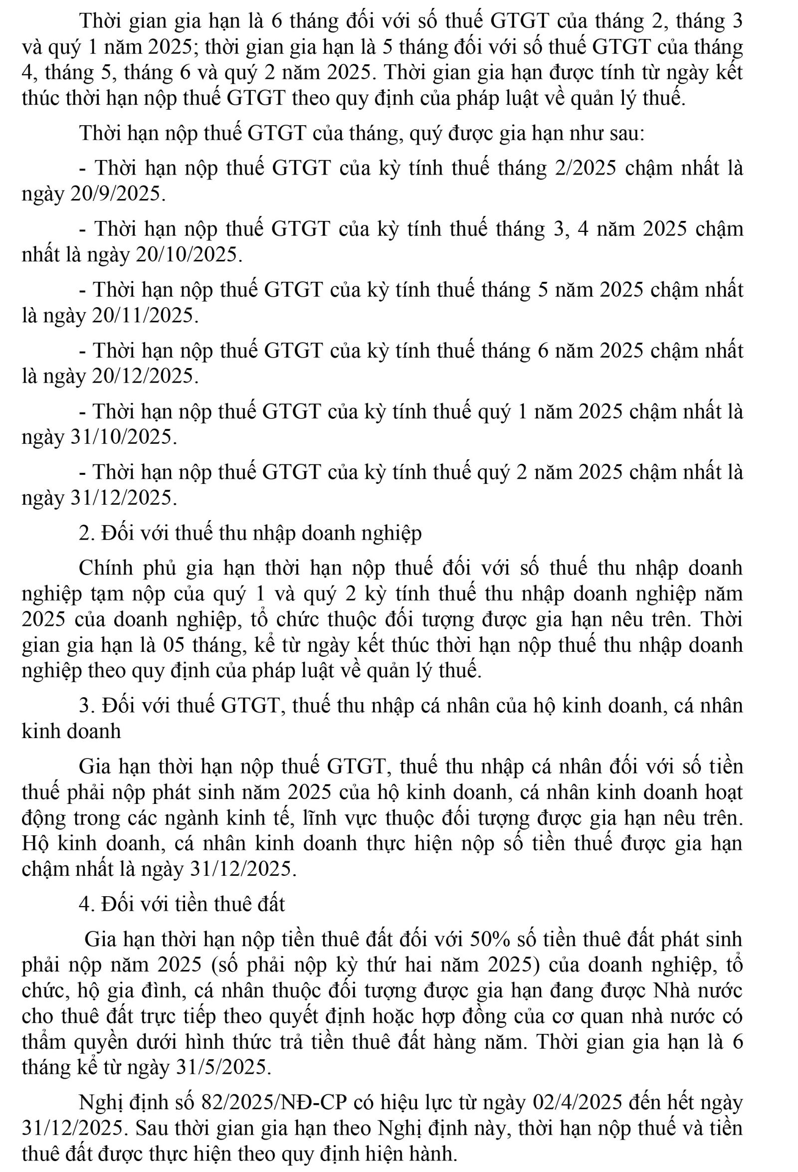 Gia hạn thời hạn nộp thuế tiêu thụ đặc biệt đối với ô tô sản xuất, lắp ráp trong nước, thuế GTGT, thuế TNDN, thuế TNCN và tiền thuê đất trong năm 2025