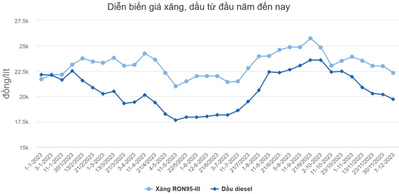 Từ đầu năm đến nay, giá nhiên liệu trong nước có 35 đợt điều chỉnh, trong đó 17 lần tăng, 13 lần giảm và 4 kỳ giữ nguyên. Sau 5 đợt giảm giá liên tiếp, mỗi lít RON 95-III hạ khoảng 2.520 đồng; E5 RON 92 cũng rẻ hơn 2.100 đồng so với đầu tháng 11. Còn dầu diesel sau 6 lần hạ, hiện thấp hơn tháng trước 2.930 đồng một lít.