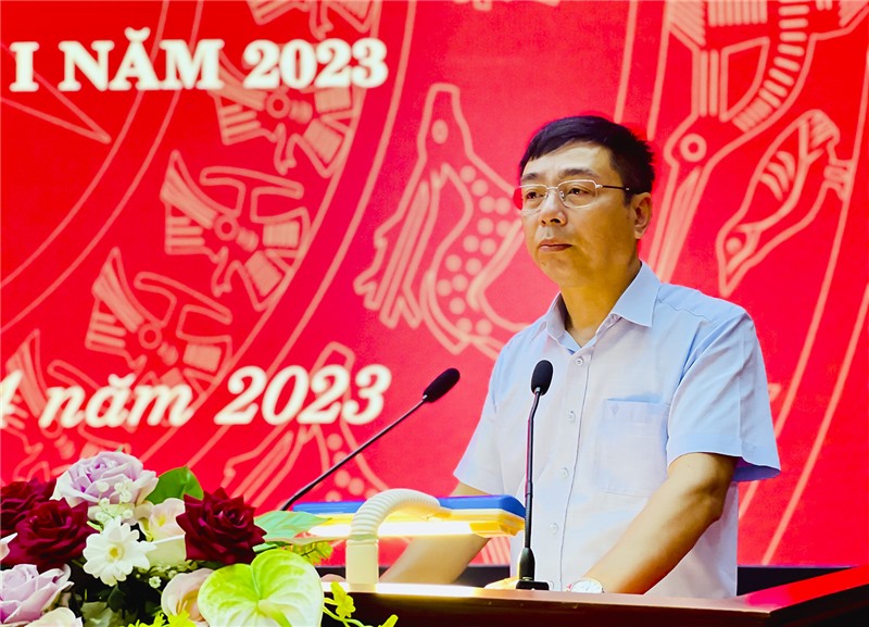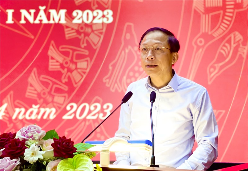 Đồng chí Nguyễn Chiến Thắng, Phó Bí thư Thường trực Thành ủy báo cáo tóm tắt kết quả thực hiện nhiệm vụ phát triển kinh tế - xã hội quý I năm 2023.