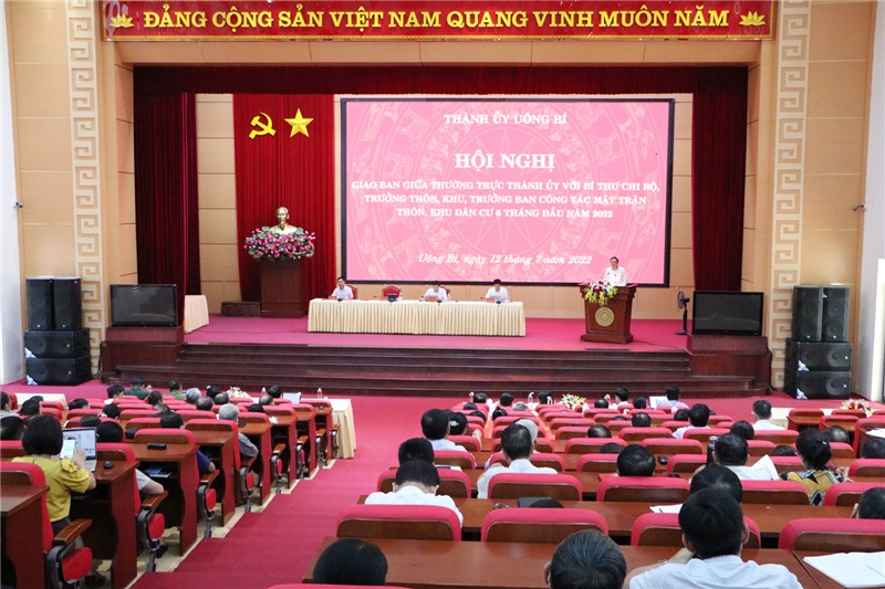 Chiều 12/7, Thành ủy Uông Bí tổ chức hội nghị giao ban giữa Thường trực Thành ủy với Bí thư chi bộ, trưởng thôn, khu, trưởng ban công tác mặt trận thôn, khu dân cư 6 tháng đầu năm 2022. Dự hội nghị có các đồng chí: Lê Thị Kim Cúc, Phó Trưởng Ban Dân vận Tỉnh ủy; Nghiêm Xuân Cường, Tỉnh ủy viên, Bí thư Thành ủy, Chủ tịch HĐND thành phố; Nguyễn Chiến Thắng, Phó Bí thư Thường trực Thành ủy; Phạm Tuấn Đạt, Phó Bí thư Thành ủy, Chủ tịch UBND thành phố; Đào Ngọc Sơn, UVBTV, Trưởng Ban Dân vận Thành ủy, Chủ tịch UBMTTQ thành phố.