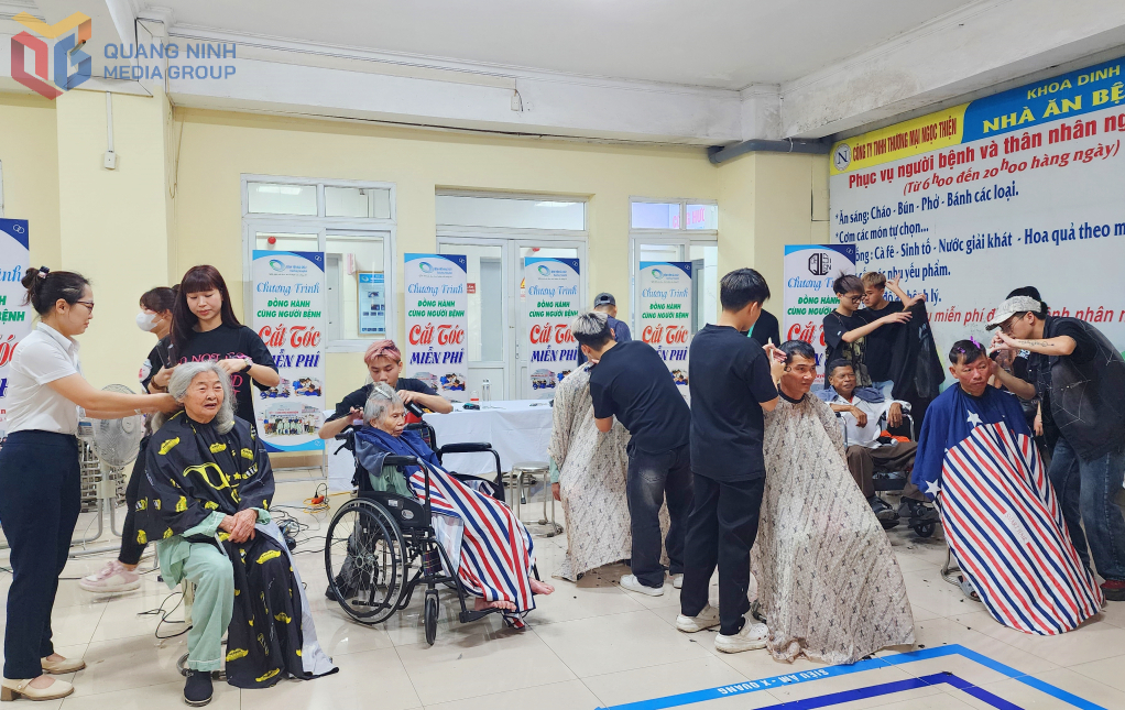 Một hình ảnh đặc biệt khác tại Bệnh viện Bãi Cháy là một buổi cắt tóc miễn phí ngay trong khuôn viên bệnh viện. Hơn hai năm qua, chị Nguyễn Thu Hường, chủ salon Quyền Linh (phường Bãi Cháy, TP Hạ Long) đã duy trì đều đặn chương trình này. “Mỗi tháng một lần, khoảng 15 thợ của chúng tôi phục vụ từ 30-40 bệnh nhân. Dù chỉ là cắt tóc, nhưng chúng tôi mong mang đến tinh thần lạc quan, giúp họ thấy mình vẫn đẹp, vẫn được quan tâm”, chị Hường chia sẻ.