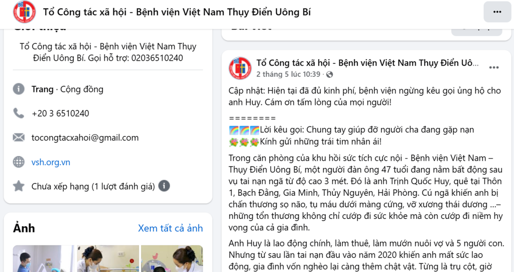 Lời kêu gọi, vận động ủng hộ trên Facebook của Tổ Công tác xã hội, Bệnh viện Việt Nam – Thụy Điển Uông Bí