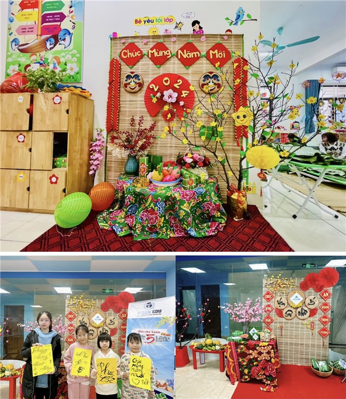Không chỉ được tham gia các hoạt động trải nghiệm nhân dịp Tết đến xuân về, các em học sinh còn được đắm chìm trong không khí chuẩn bị đón Tết, qua các hình ảnh tái hiện: chợ quê, chợ hoa ngày Tết; trang hoàng, dọn dẹp bày trí, nhà cửa, sửa biện bàn thờ, bày mâm ngũ quả … Việc tái hiện không khí đón Tết giúp các em hiểu thêm về phong tục tập quán lâu đời của dân tộc, từ đó thêm yêu và trân trọng những giá trị văn hóa truyền thống.