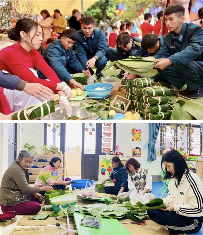 Tại đây, các em học sinh hào hứng khi được trực tiếp tham gia gói bánh chưng với sự hướng dẫn tận tình của giáo viên và phụ huynh. Tục gói bánh chưng ngày Tết đã trở thành nét văn hóa truyền thống của dân tộc Việt Nam, được lưu truyền từ xa xưa đến tận ngày nay, thể hiện nét đẹp của nền văn hóa lúa nước. Mỗi khi Tết đến xuân về, người người, nhà nhà lại gói bánh chưng Tết, dâng bánh lên bàn thờ tổ tiên.