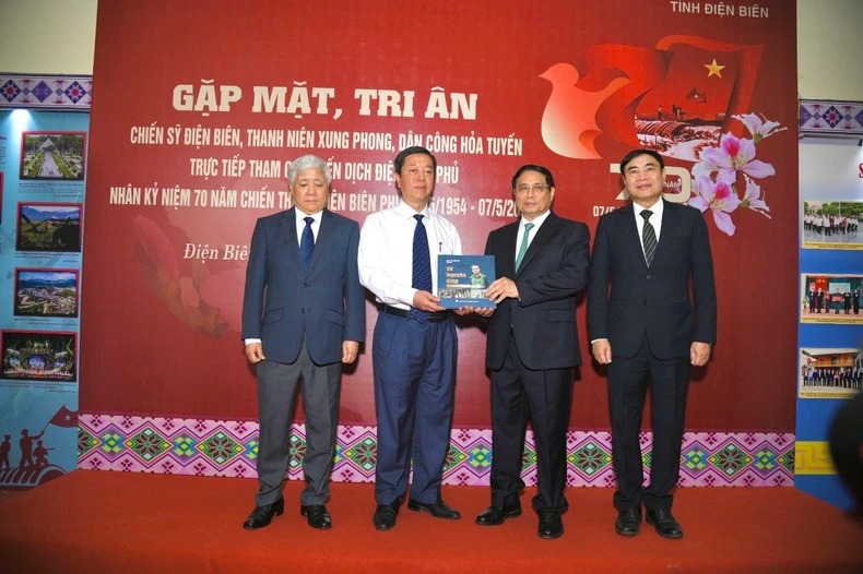 Tại buổi gặp mặt, tri ân chiến sĩ Điện Biên, tại TP Điện Biên Phủ, PGS, TS Vũ Trọng Lâm, Giám đốc-Tổng Biên tập Nhà xuất bản Chính trị quốc gia Sự thật trao tặng Thủ tướng Chính phủ Phạm Minh Chính bộ sách "Võ Nguyên Giáp - Vị tướng của nhân dân".