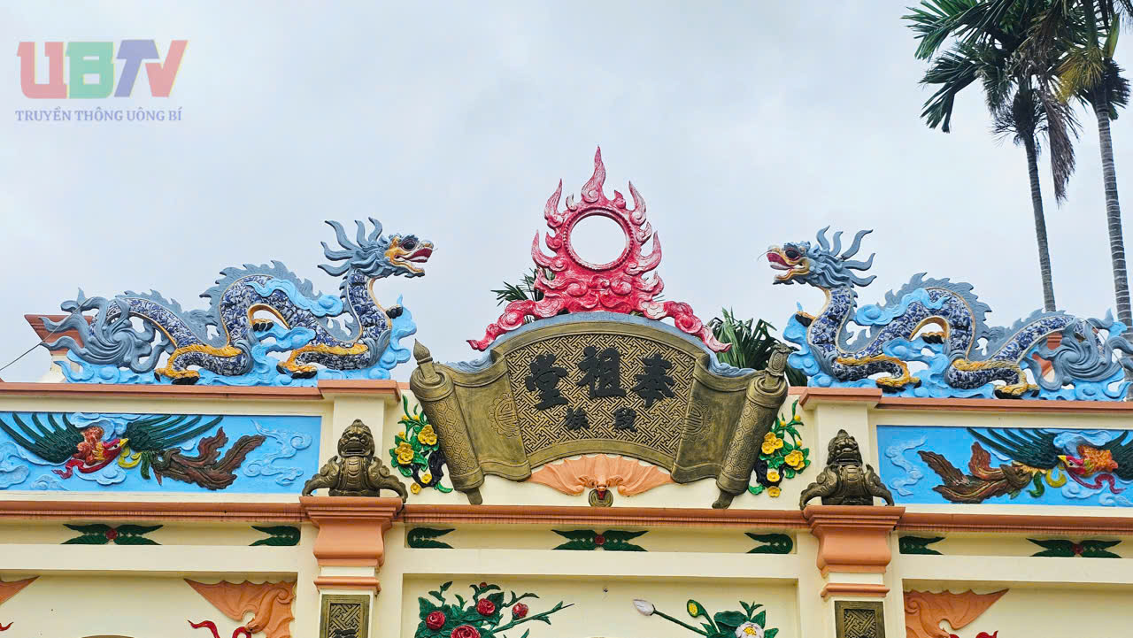 Phía trước mái có bức cuốn thư, hai bên đắp nổi hình lưỡng long chầu nhật (hai rồng chầu mặt trời) – biểu tượng phong thủy và sự cao quý.