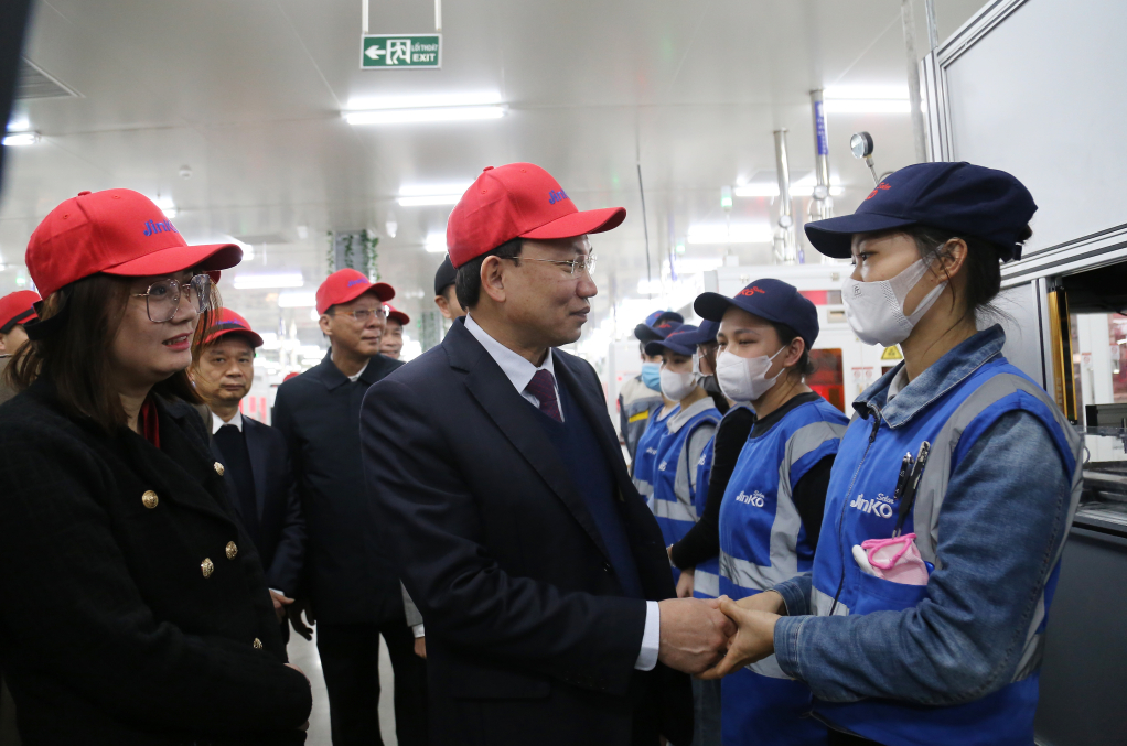Đồng chí Bí thư Tỉnh ủy, Chủ tịch HĐND tình động viên công nhân làm việc xuyên Tết và kiểm tra tình hình sản xuất tại Công ty TNHH Công nghiệp Jinko Solar Việt Nam (KCN Sông Khoai, TX Quảng Yên) ngày mùng 1 Tết.