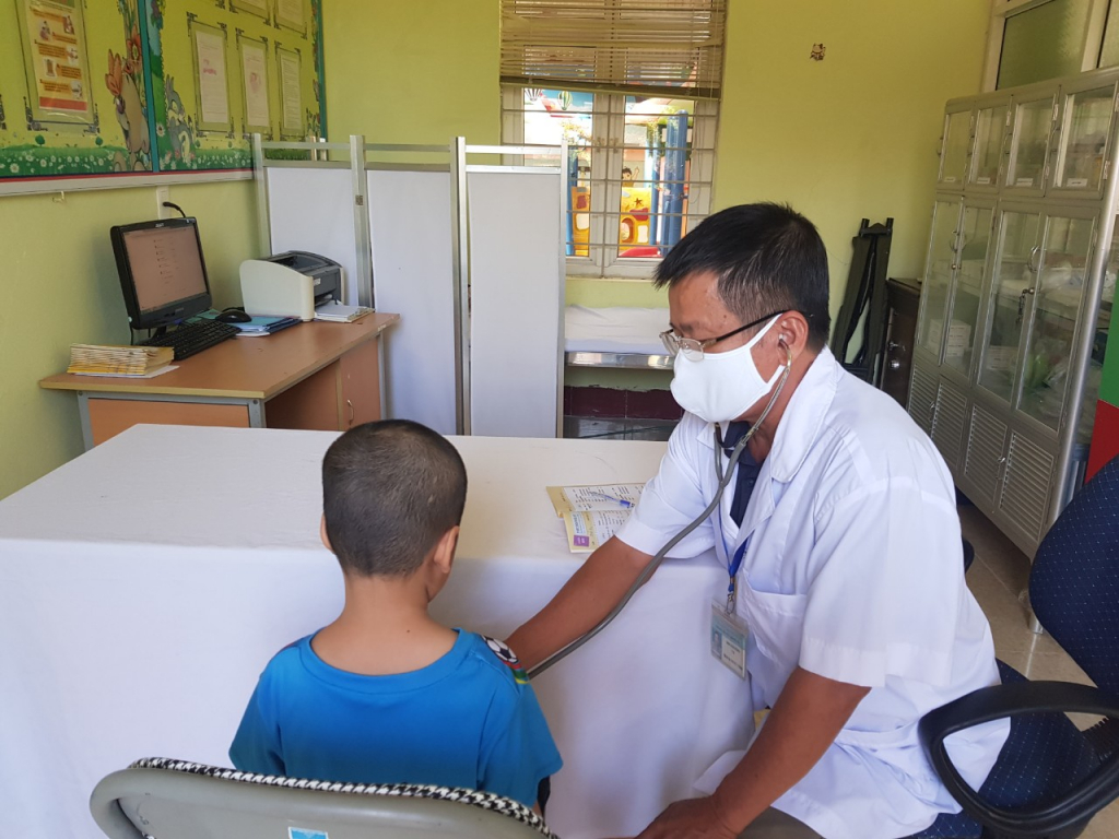 Nhân viên y tế Trường Mầm non thị trấn Quảng Hà (huyện Hải Hà) kiểm tra sức khỏe cho học sinh.