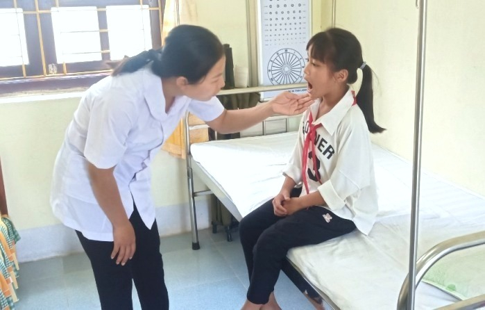 Nhân viên y tế Trường Phổ thông Dân tộc bán trú TH&THCS Đồng Văn (huyện Bình Liêu) kiểm tra sức khỏe cho học sinh. (Ảnh chụp tháng 11/2020)